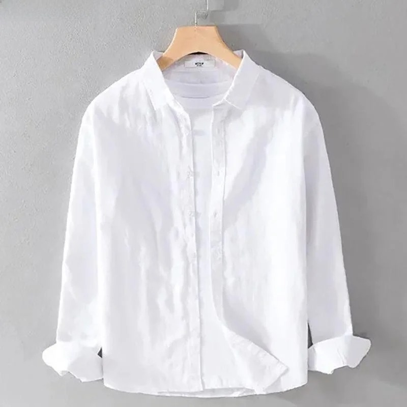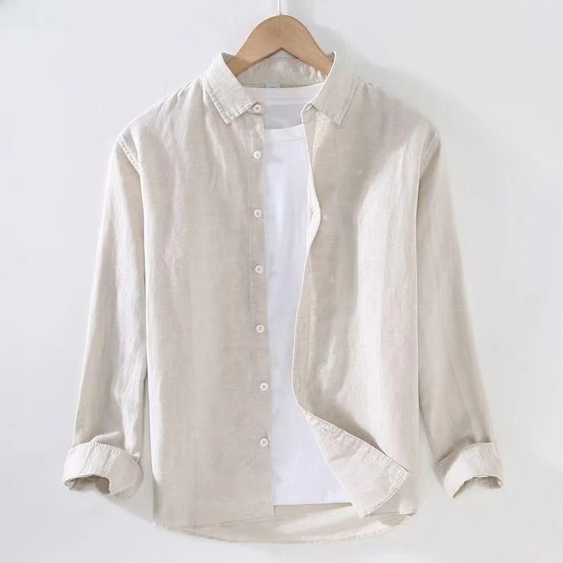 قميص رجالي جديد خفيف وعملي، بأكمام طويلة ولون واحد، مصنوع من مزيج القطن والكتان لراحة وتهوية ممتازة. تصميم فضفاض يناسب الشباب، عملي للبس اليومي والإطلالات العصرية في الصيف والمناسبات الخفيفة.